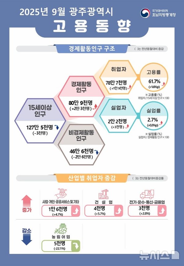 17일 국가데이터처 호남통계청이 발표한 2025년 9월 고용동향에 따르면 9월 광주시 고용률은 61.7%로 전년동월대비 1.6%포인트 상승했다.